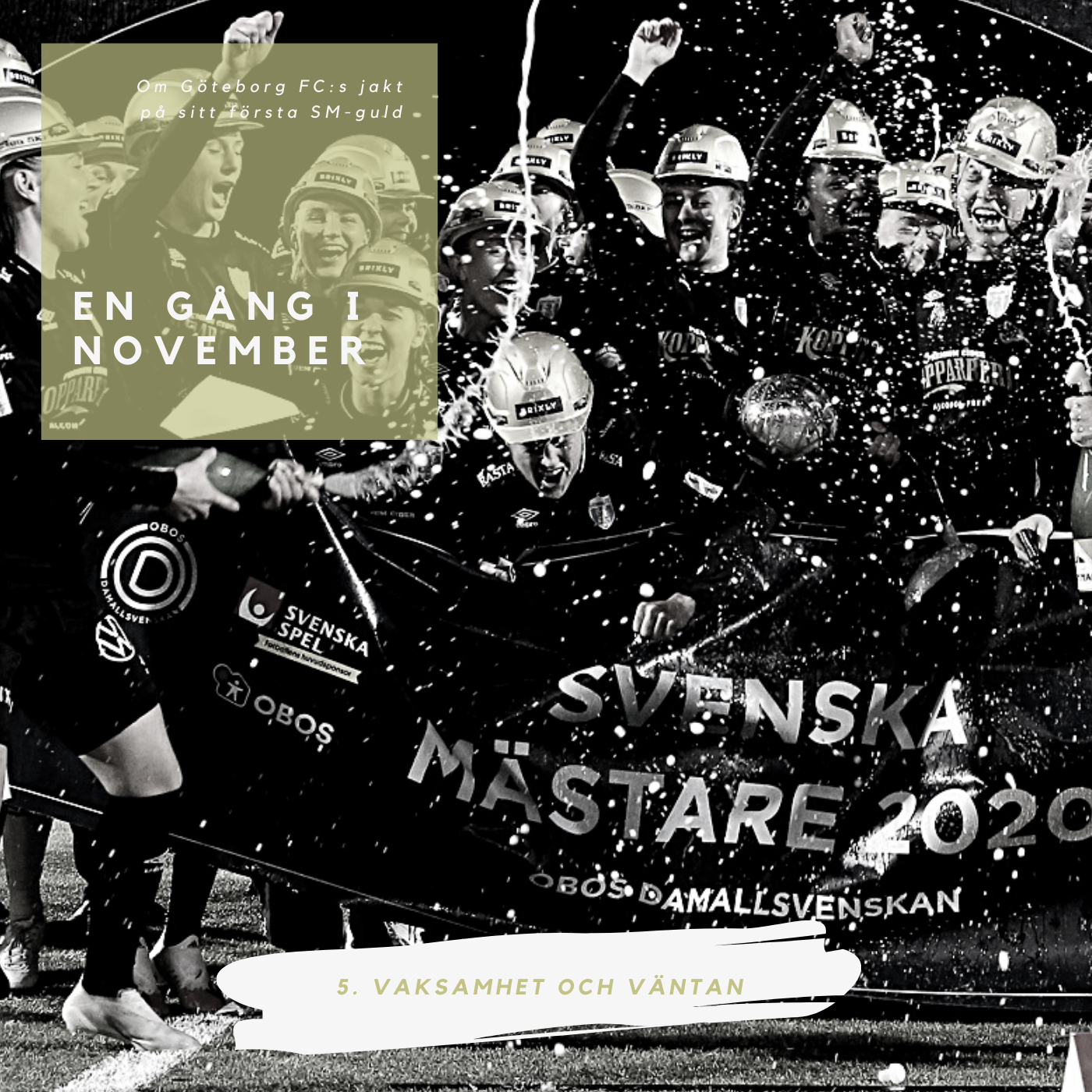 Fem matcher ligger mellan Göteborg FC och klubbens första guld. Anförda av sin lagkapten Emma Berglund, som trots sin skadehistorik och det faktum att klubben meddelat att hon får sparken efter säsongen spelar sin bästa fotboll på många år, bjuder man – förutom en plump hemma mot Örebro – på idel segrar. När man åker till Linköping och näst sista seriematchen för säsongen kan man säkra klubbens första SM-guld. Man vinner med osannolika 7–0 och när bucklan lyfts i den sista matchen mot Vittsjö hemma på Valhalla IP finns det bara en sak kvar att ta reda på. Eller är jag på jakt efter svar på en fråga jag inte kan få? Intervjuer med Jonas Eidevall, Emma Kullberg & Julia Zigiotti, Hanna Wijk, Marcus Lantz, Filippa Angeldahl, Beata Kollmats, Emma Berglund, Rebecka Blomqvist, Julia Roddar och Jörgen Ericsson. Del 5 av 5. Längd: 48:47. Foto: Per Montini.